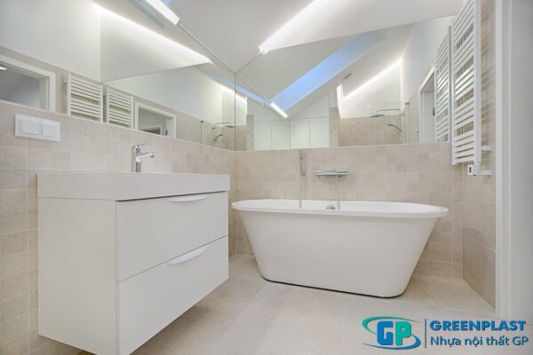 Lựa chọn tuyệt vời để thiết kế tủ Lavabo cho nội thất phòng tắm nhà bạn chính là tấm nhựa GP Greenplast. Tấm nhựa GP là vật liệu có khả năng chống nước tuyệt đối. Bên cạnh đó, tấm nhựa GP còn là vật liệu nhẹ nên dễ dàng thi công và treo trên tường và đặc biệt nhựa không bị mối mọt, ẩm mốc hiệu quả.